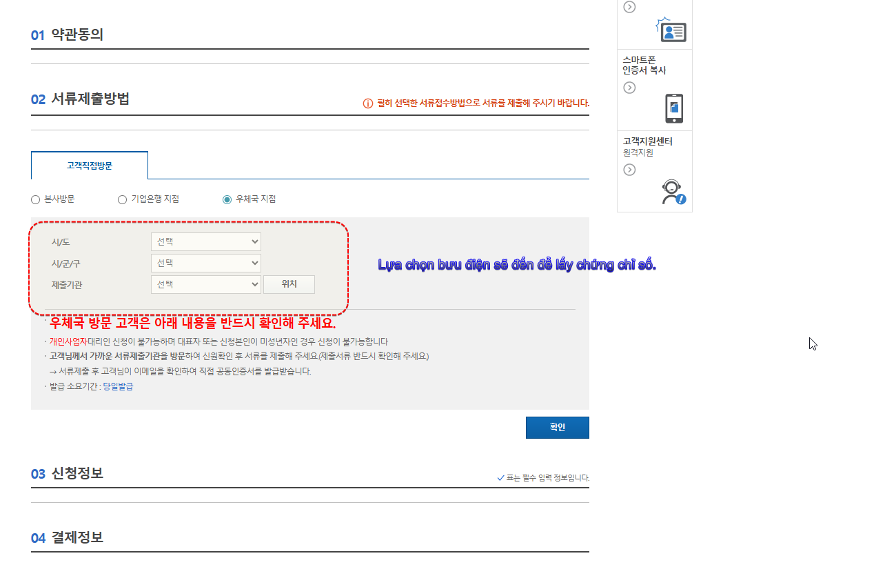 Sau khi điền xong thông tin, bạn sẽ được chuyển đến trang thanh toán. Phí đăng ký chứng chỉ này thường khoảng 4,400 won (tùy thời điểm). Sau khi thanh toán thành công, hệ thống sẽ yêu cầu bạn chọn một bưu điện (우체국) gần nhất để đến nhận một giấy tờ xác nhận.